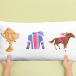 The WIN PLACE SHOW art is represented by the trophy, the jockey coat and hat, and the horse running. The lumbar pillow is 14 x 20 inches. The derby design will certainly help prepare your home or office for the special season of the year.