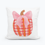 This pumpkin is one of the best-dressed that we've seen in its plaid cover and pretty pink bow! It will dress up our closed but washable 12", 18" or 22" square pillow.