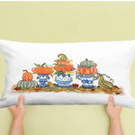 The lumbar pillow is available in 14 x 20 inch size. In the fall we can stack those pumpkins on blue chinoserie candlesticks and create a beautiful display just as this artist chose to do in the original painting.
