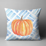 A hand-painted orange watercolor pumpkin with a sky blue pattern background on a square 18 or 22" pillow