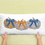 The lumbar pillow is available in 14 x 20 inch size. These pumpkins have varied fall-colored patterns drawn by the artist with blue bows to finish off the design.
