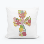 The cross made up of beautifully colored flowers is featured on our square handmade pillows