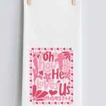 Add a meaningful pop of color and faith-inspired charm to your kitchen with this art-based decorative tea towel made of cotton flour sack fabric. Featuring the heartfelt phrase “Oh How He Loves Us” in beautiful shades of pink and red, this design blends uplifting sentiment with modern, artistic style. The expressive typography and layered color palette make it a standout accent for your kitchen area.