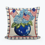 "Kristie's Americana Hydrangeas features a glossy blue vase overflowing with light blue hydrangeas and three waving American flags. Festive, patriotic still life with red, white & blue charm." 12" 18" and 22" pillow