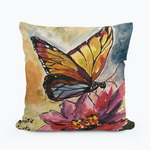 The jewel tones in the butterfly, flower and background make a rich design for the square pillow. The handmade pillow is available in three sizes.