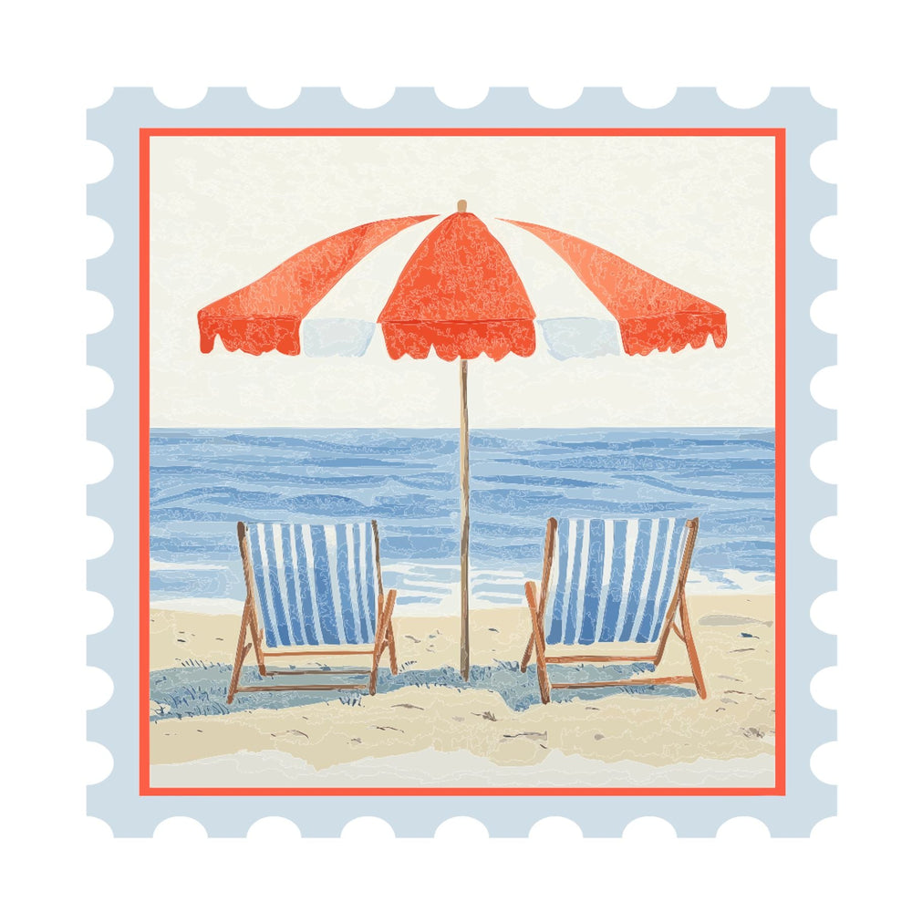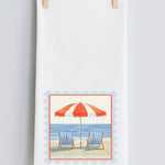 The Americana theme continues with the beach chairs and umbrella in the traditional red, white and blue. The design is printed on LuckyBird's 100% cotton tea towel..