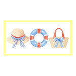 The Americana theme continues with the sunhat, the buoy, and the beach bag in the traditional red, white and blue. The design is printed on LuckyBird's lumbar handmade pillow swap. The swap will fit any of the lumbar LuckyBird button pillows.