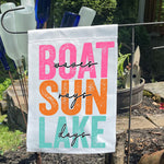 A fun day at the lake includes both boat waves and sun rays! This design on the LuckyBird Garden Flag lets you share your love of the lake and all it entails.
