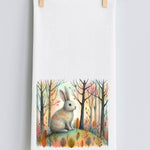The brown bunny sitting in the colorful woods is a great celebration of spring and Easter season printed on a tea towel.. LuckyBird's tea towels are made of 100% cotton flour sack fabric.
