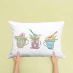 Add a playful touch to your space with our Birds in Teacups< lumbar pillow. This 14" x 20" design features charming watercolor birds perched inside whimsical teacups, each one brimming with personality and color. The soft pastel palette and delicate hand-drawn style bring a lighthearted, artistic flair to your décor—perfect for a cozy chair, reading nook, or kitchen bench. A delightful conversation piece thatâ equal parts fun and fancy