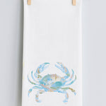 The blue crap painted by the artist has a beautiful pattern of color to display on a LuckyBird tea towel. This tea towel is 100% cotton flour sack fabric.
