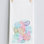 A favorite past time at the beach is collecting varied shells. This design by our artist is printed on the LuckyBird tea towel made of 100% cotton flour sack fabric.