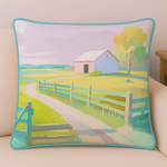 THE SQUARE PILLOW IS AVAILABLE IN 18 X 18 AND 22 X 22 INCH SIZE. THE ARTIST USES PASTEL WATERCOLORS TO DEPICT THIS LOVELY LANDSCAPE WITH THE WARM FEELING OF GOING HOME.