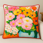 The square pillow is available in an 18 x 18 and 22 x 22 inch size. A bouquet of bright flowers gathered from the market from the paintbrush of a new LuckyBird partner artist.