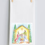 The watercolor art nativity is brightly colored and featured on the 18 x 26 inch polyester blend tea towel.