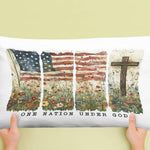 Celebrate faith and patriotism with our One Nation Under God lumbar pillow. This 14" x 20" design features a stunning watercolor scene of American flags and a wooden cross rising from a vibrant wildflower meadow. The hand-painted style and rich detail evoke a heartfelt message of unity, freedom, and devotion. A meaningful accent for your home—perfect for Independence Day, Memorial Day, or year-round inspiration.