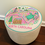 Bring home the charm of the Carolinas with the WanderSouth North Carolina Round Ottoman. This 19-inch handcrafted accent piece features a vibrant, artist-designed top celebrating North Carolina’s iconic beauty—from coastal lighthouses and sea turtles to mountain peaks and blooming dogwoods. Wrapped in a natural fabric base with cheerful turquoise cording, it’s perfect for porches, dorms, or sunny living spaces. A playful mix of color and culture, this ottoman brings Southern spirit and comfort into any room.