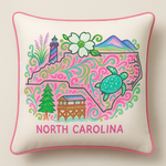 Capture the charm of the Tar Heel State with the WanderSouth North Carolina Pillow. This square pillow features a hand-drawn watercolor design filled with beloved North Carolina icons—like lighthouses, the Blue Ridge Mountains, cardinal birds, and sweet tea. With soft colors and thoughtful detail, it brings the state’s coastal to mountain beauty into your home. Available in 18" x 18" or 22" x 22" WITH A CUSTOM PINK CORDING.